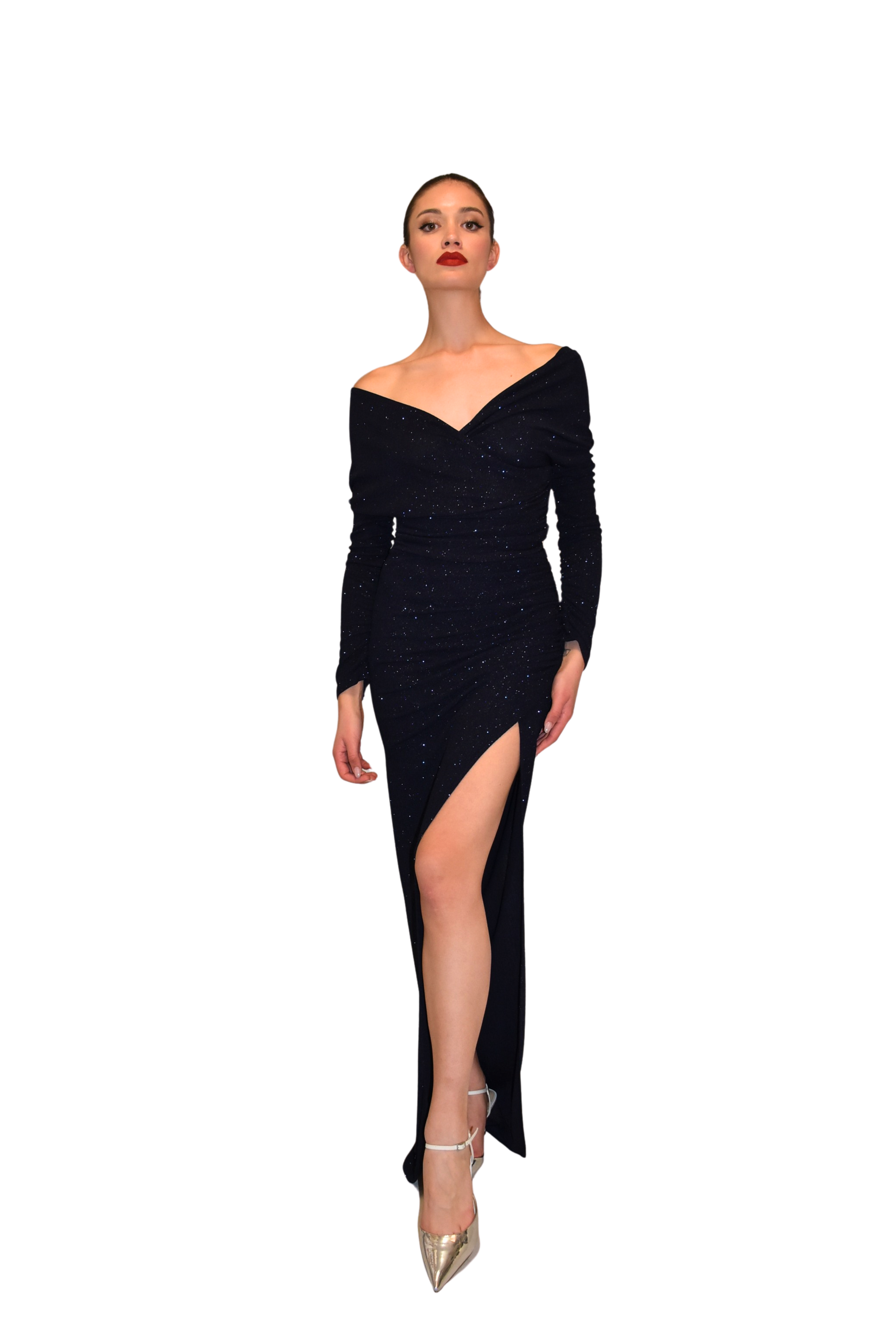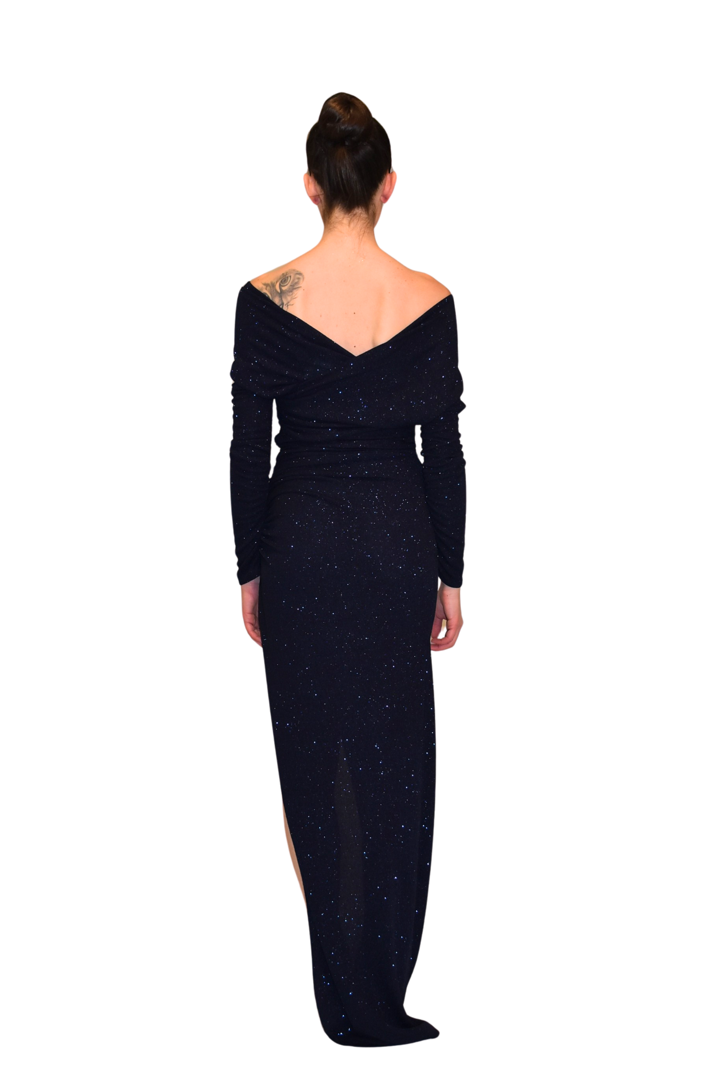 Abito lungo in tessuto di jersey metallizzato blu, modello dalla linea fasciante con drappeggi laterali e profondo spacco laterale.