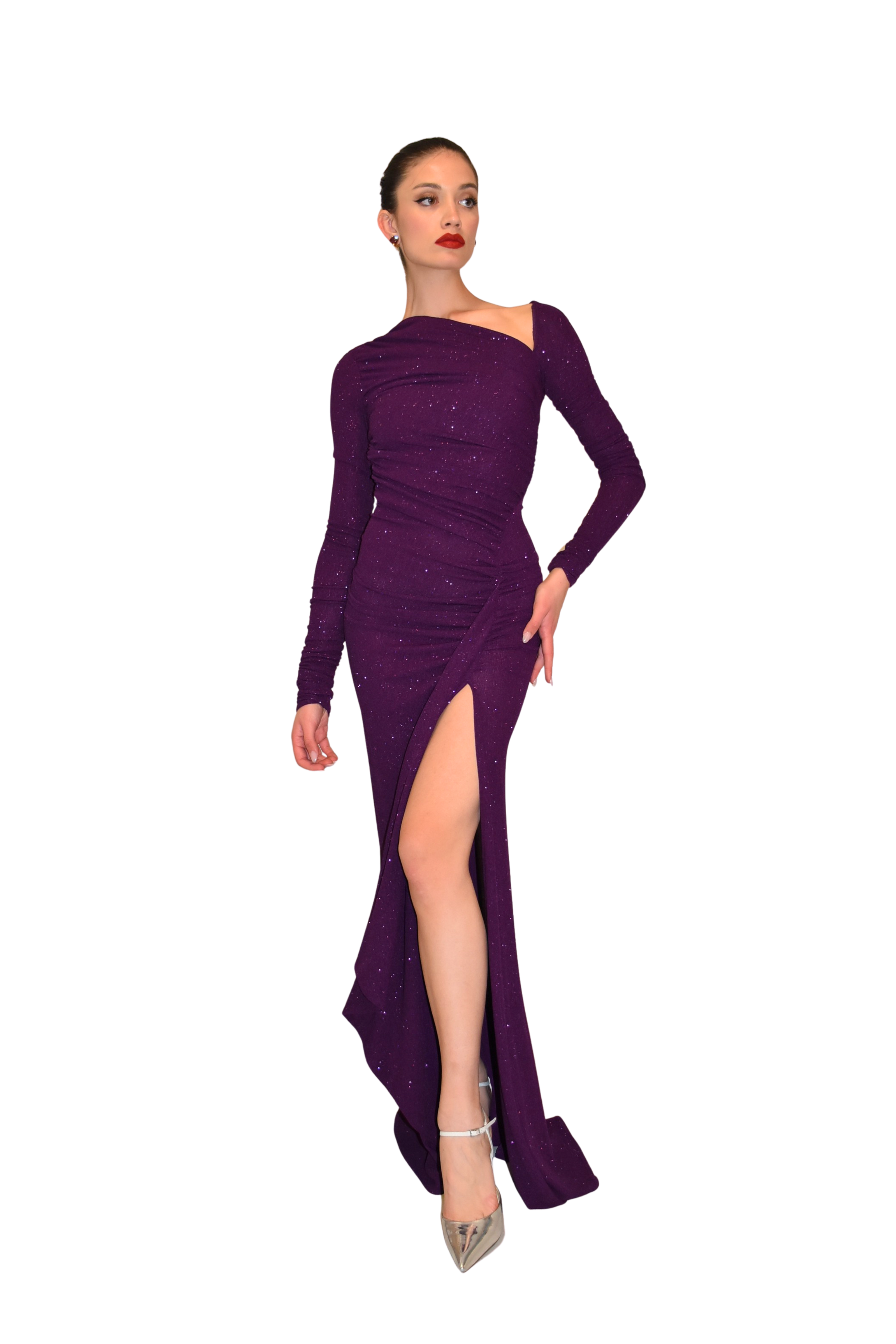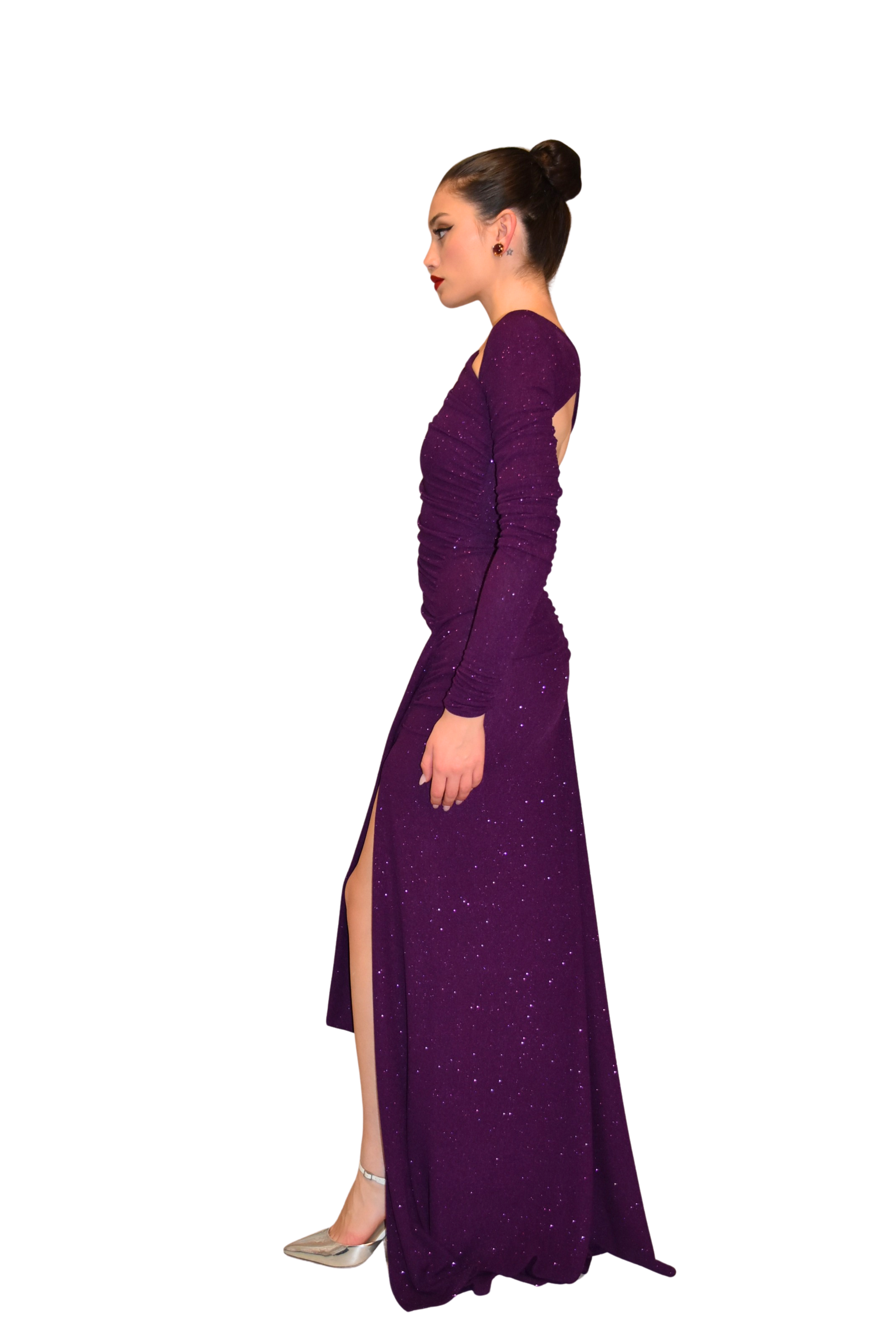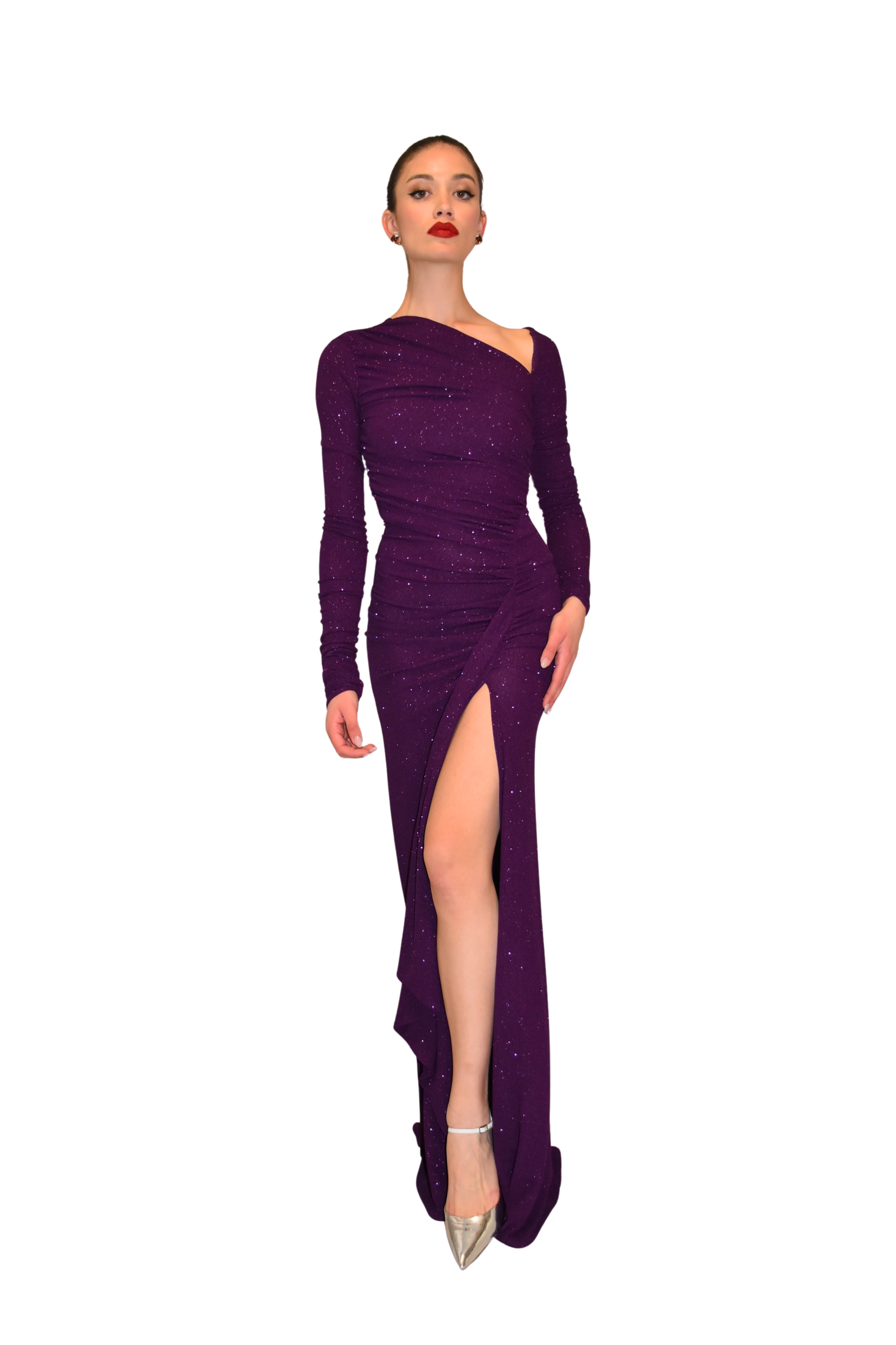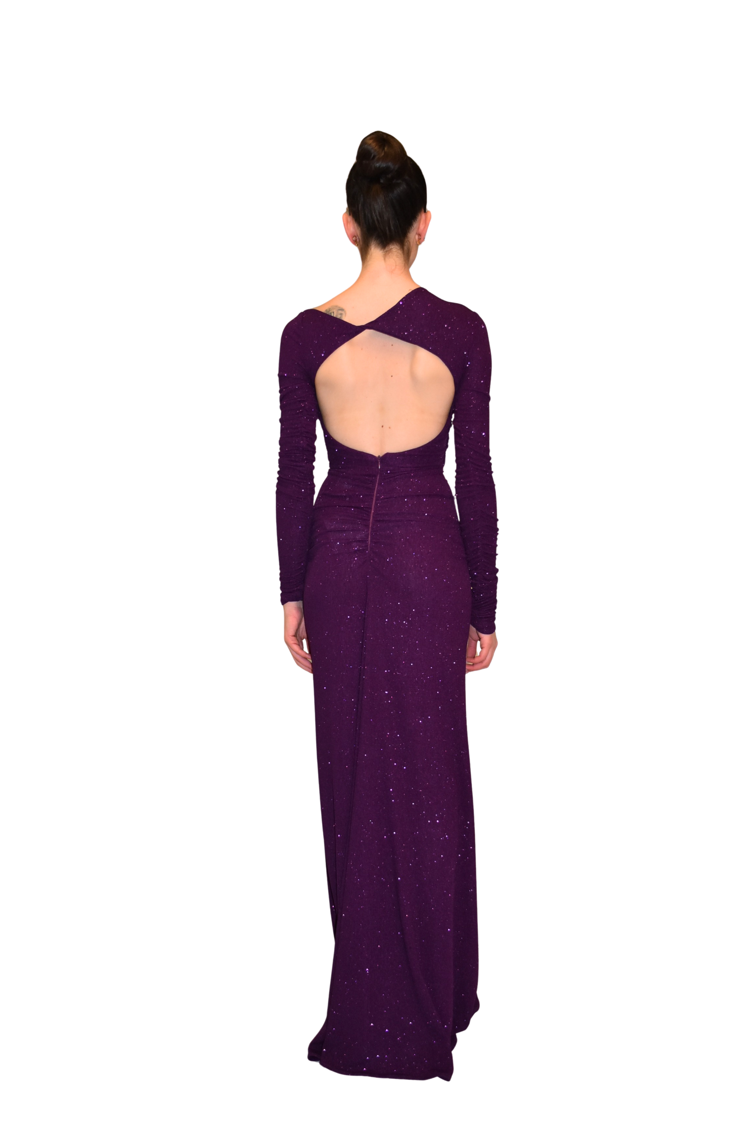 Abito lungo in tessuto in jersey metallizzato color melanzana, modello dalla linea fasciante con drappeggi laterali.