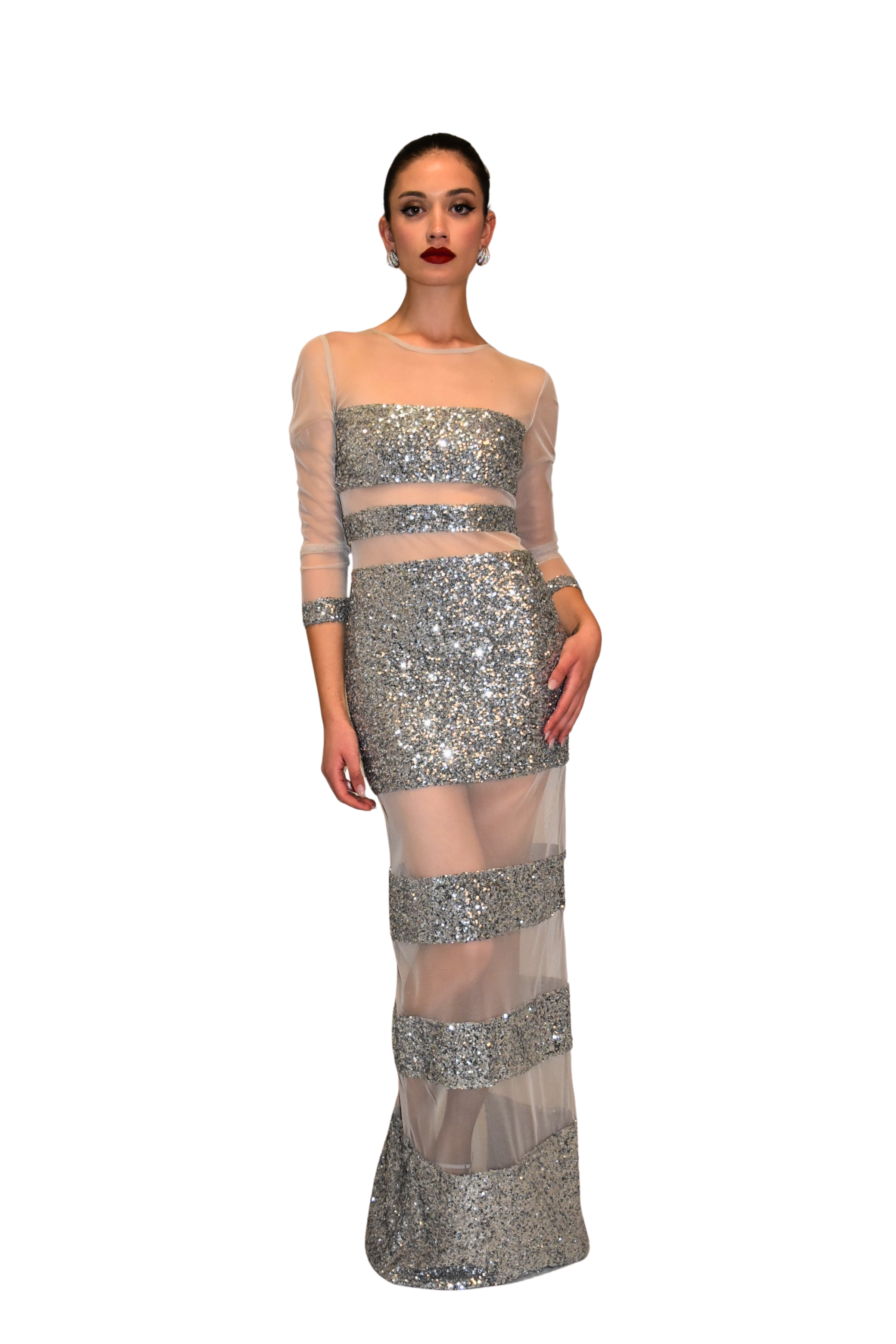 Abito lungo in tulle trasparente nude alternato a payettes argento, modello fasciante a manica lunga con spacco posteriore.