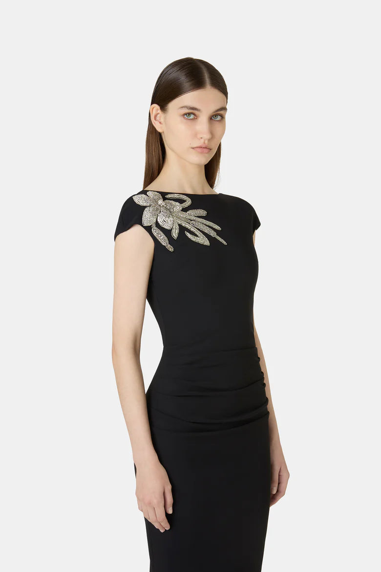 Abito midi Hesup in jersey stretch nero con drappeggio sul fianco, dettaglio ricamato fatto a mano sulla spalla sinistra.