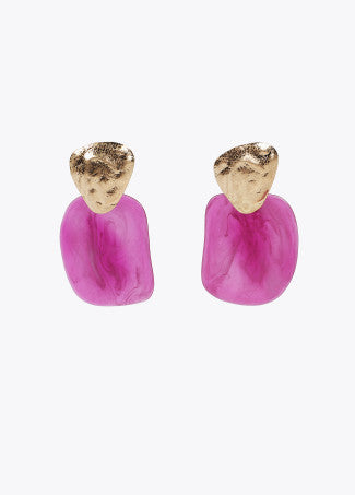 Orecchini dal design unico in metallo dorato e acrilico color bougainvillea.