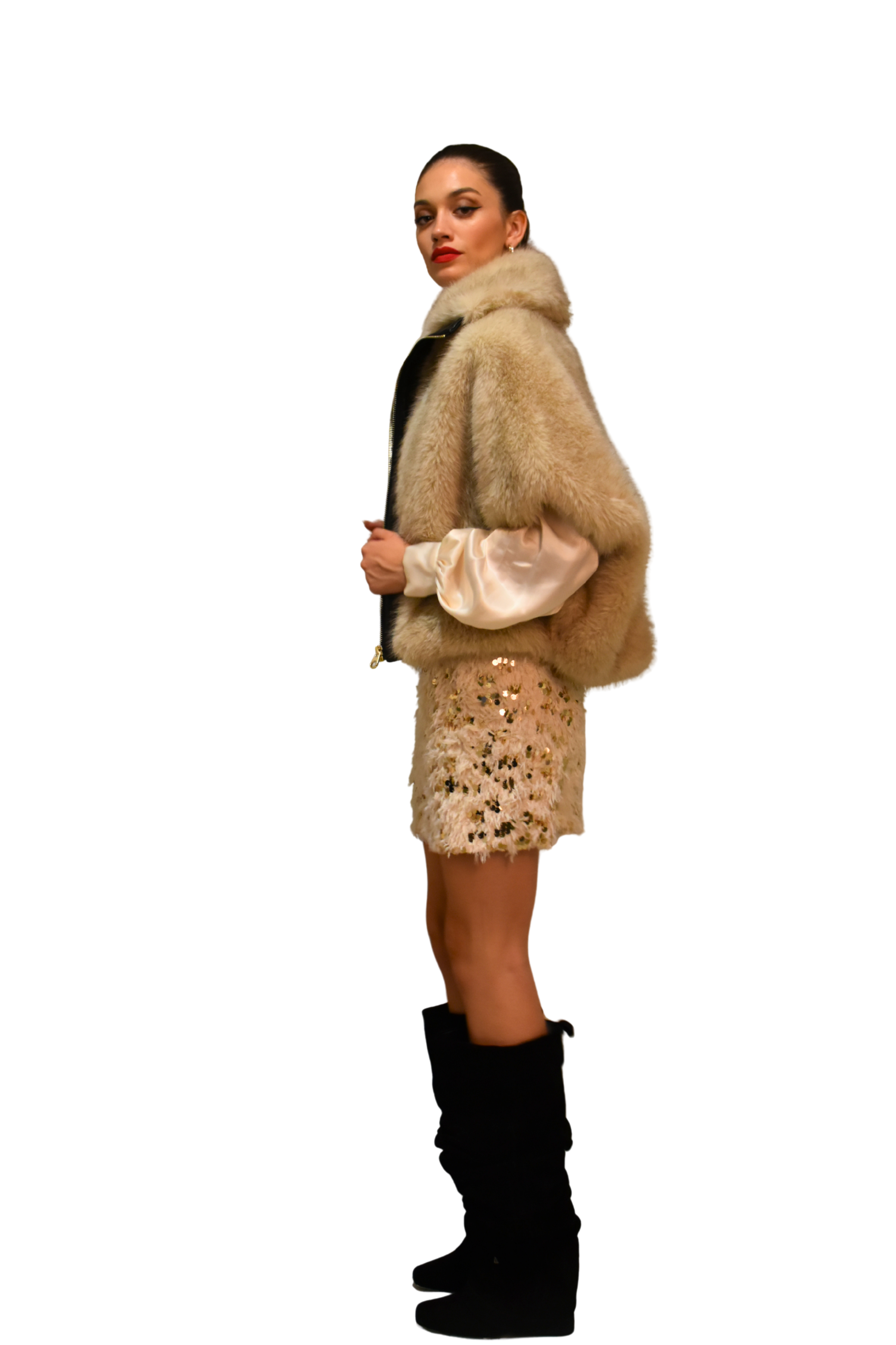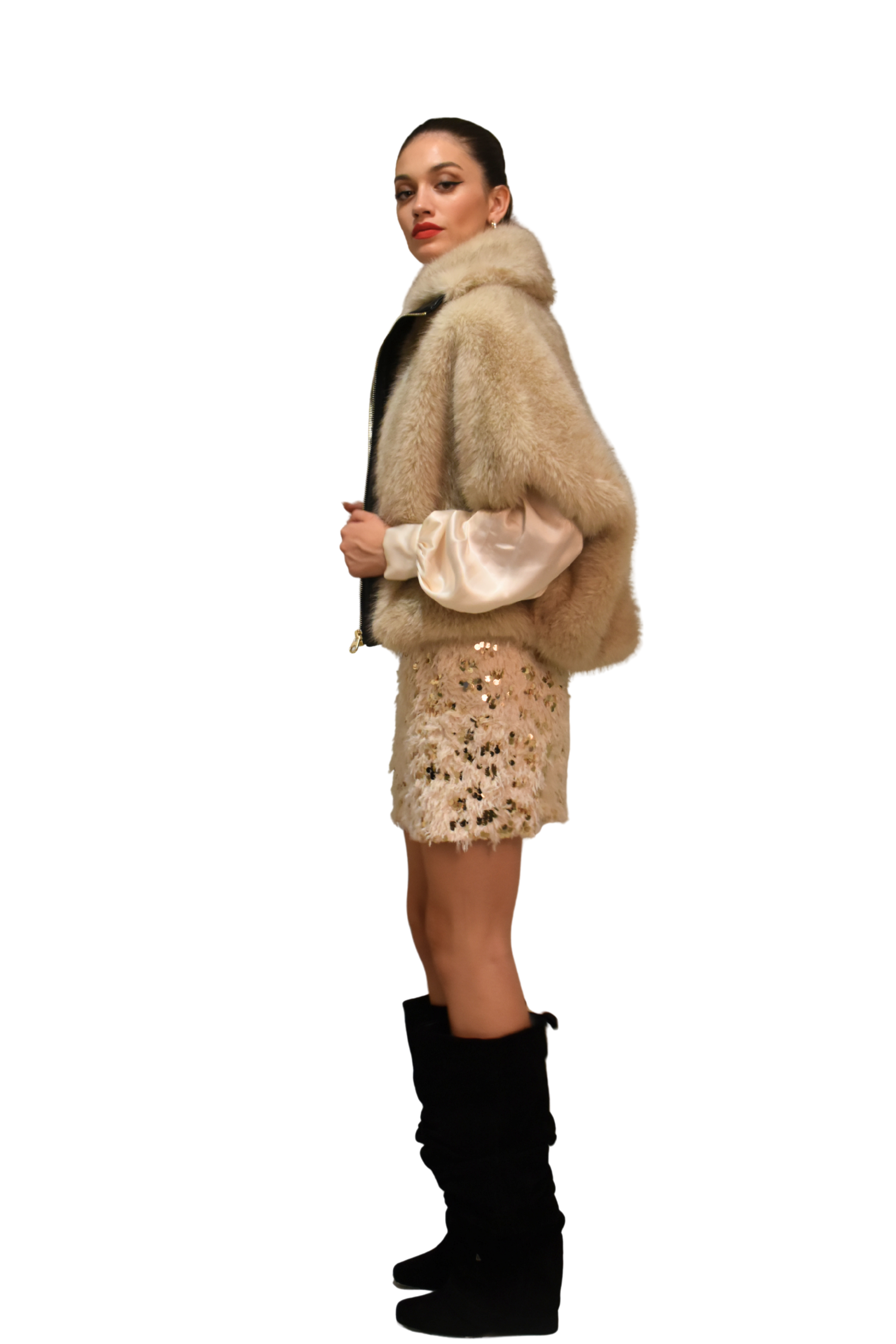 Giacca modello blouson in pelliccia sintetica color sabbia, modello effetto cappa con maniche a tre quarti.