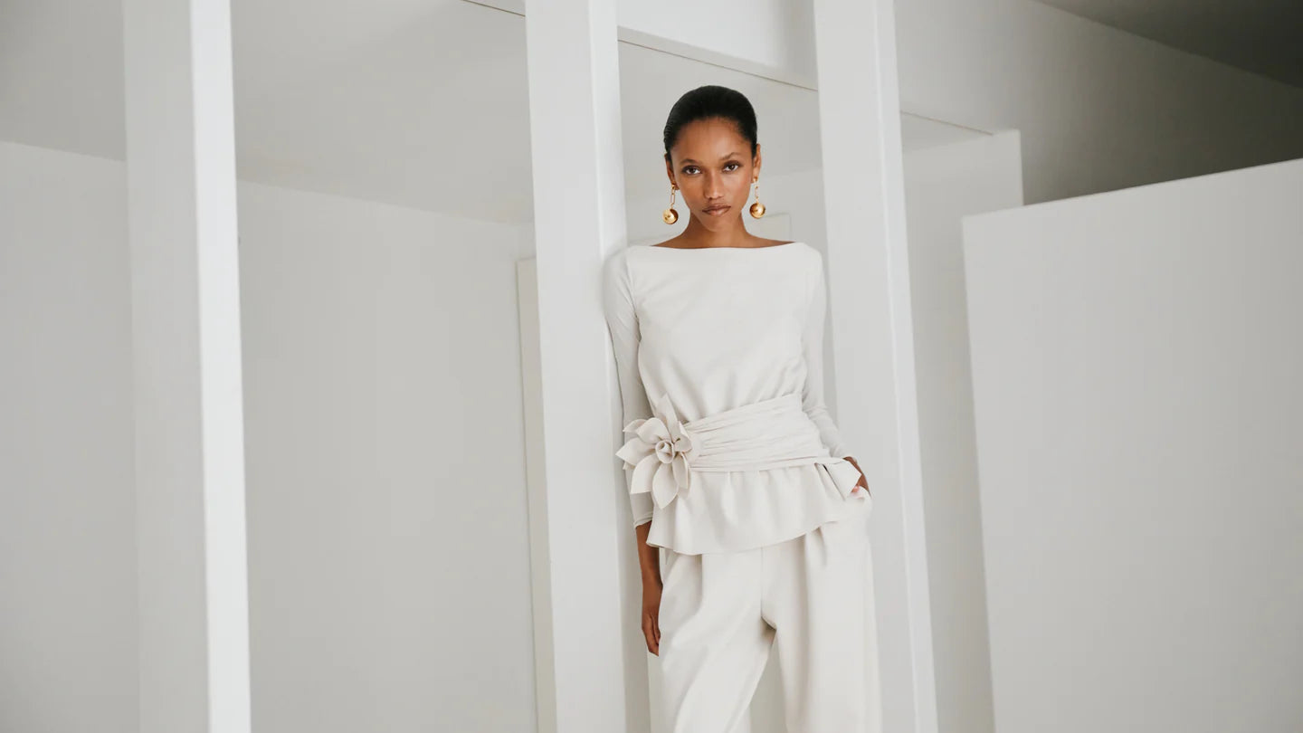 Blusa Meipel realizzata in tessuto tecnico stretch color sabbia, arricchita da fascia drappeggiata cucita che termina sul lato con un elegante dettaglio floreale da aggiungere separatamente.