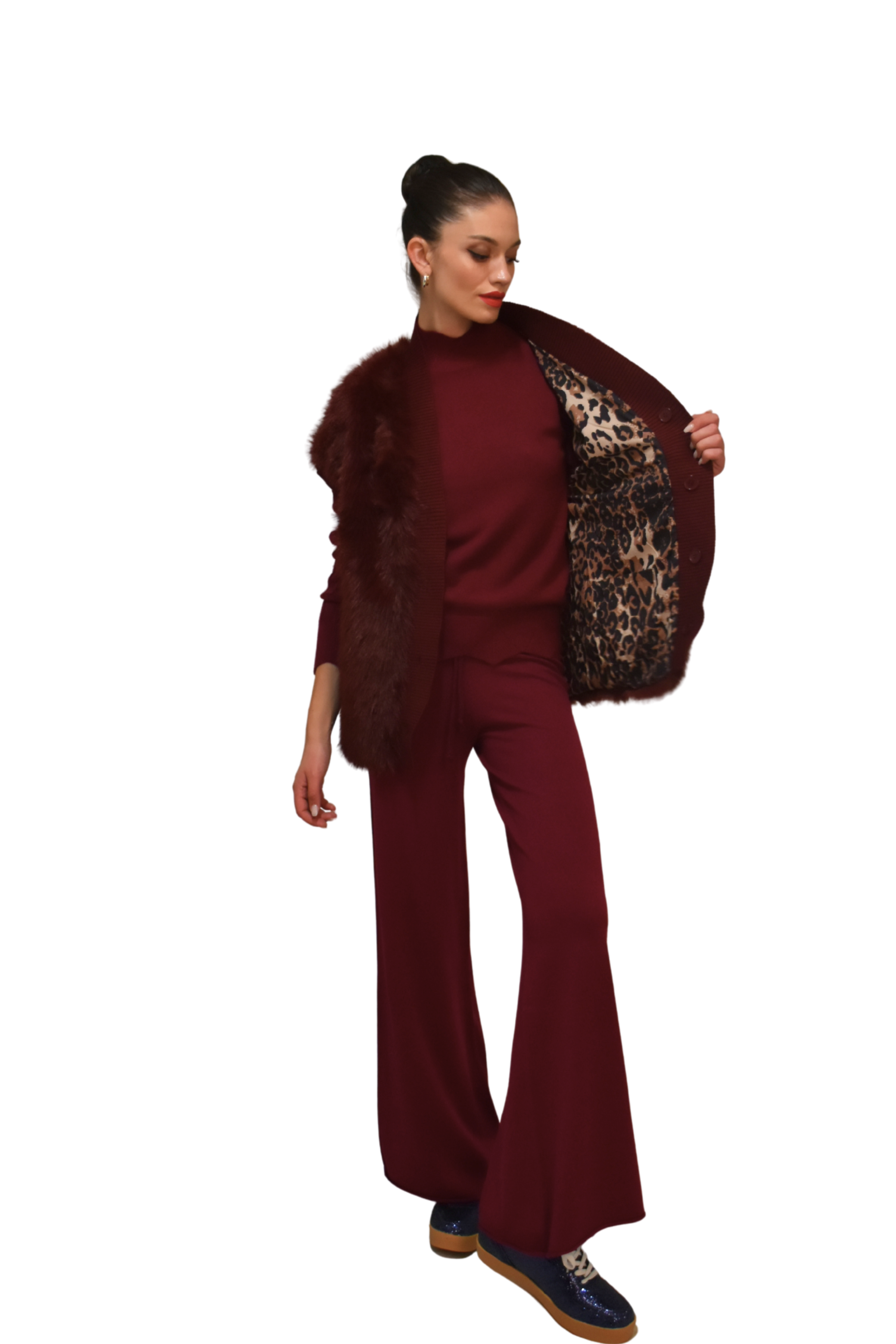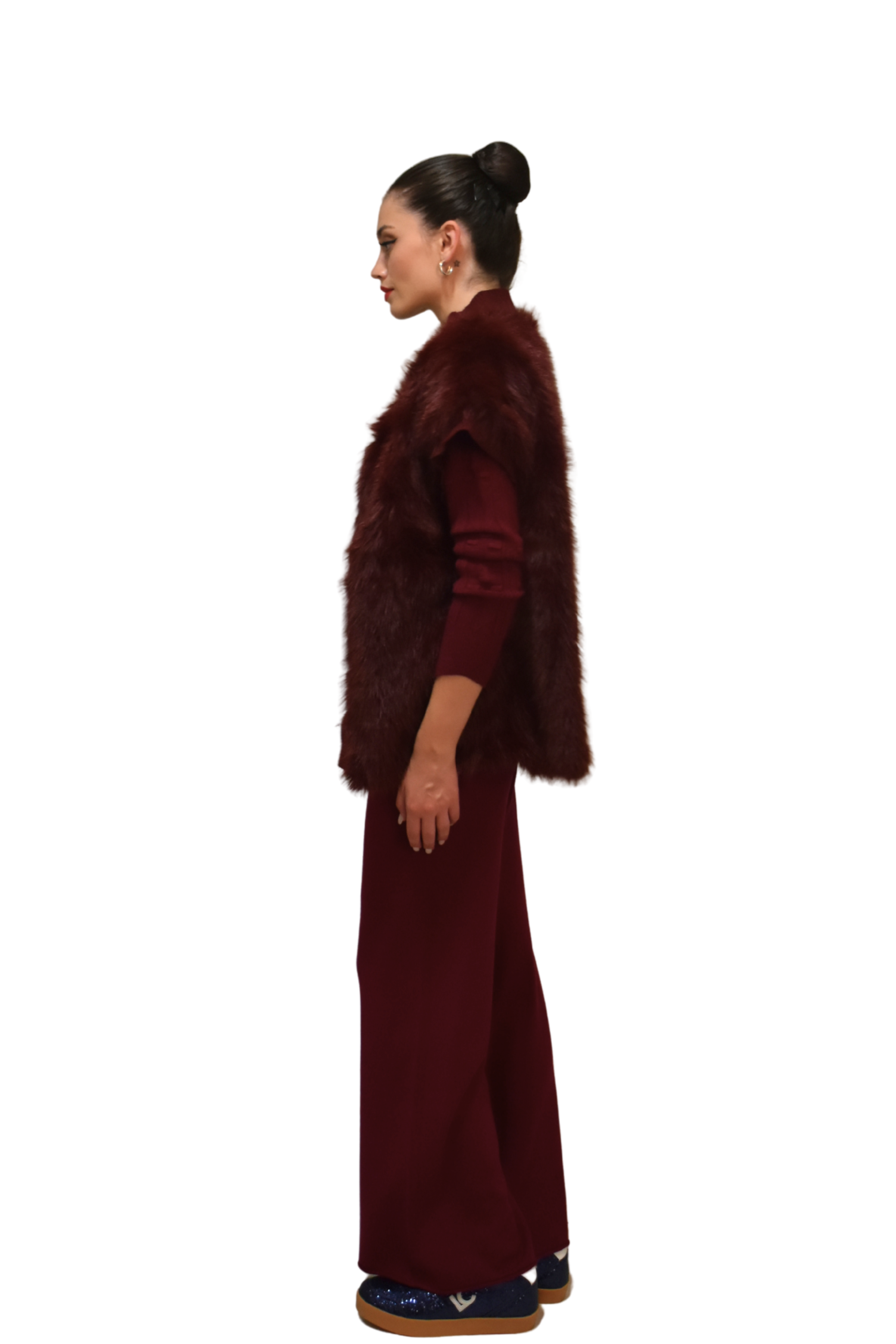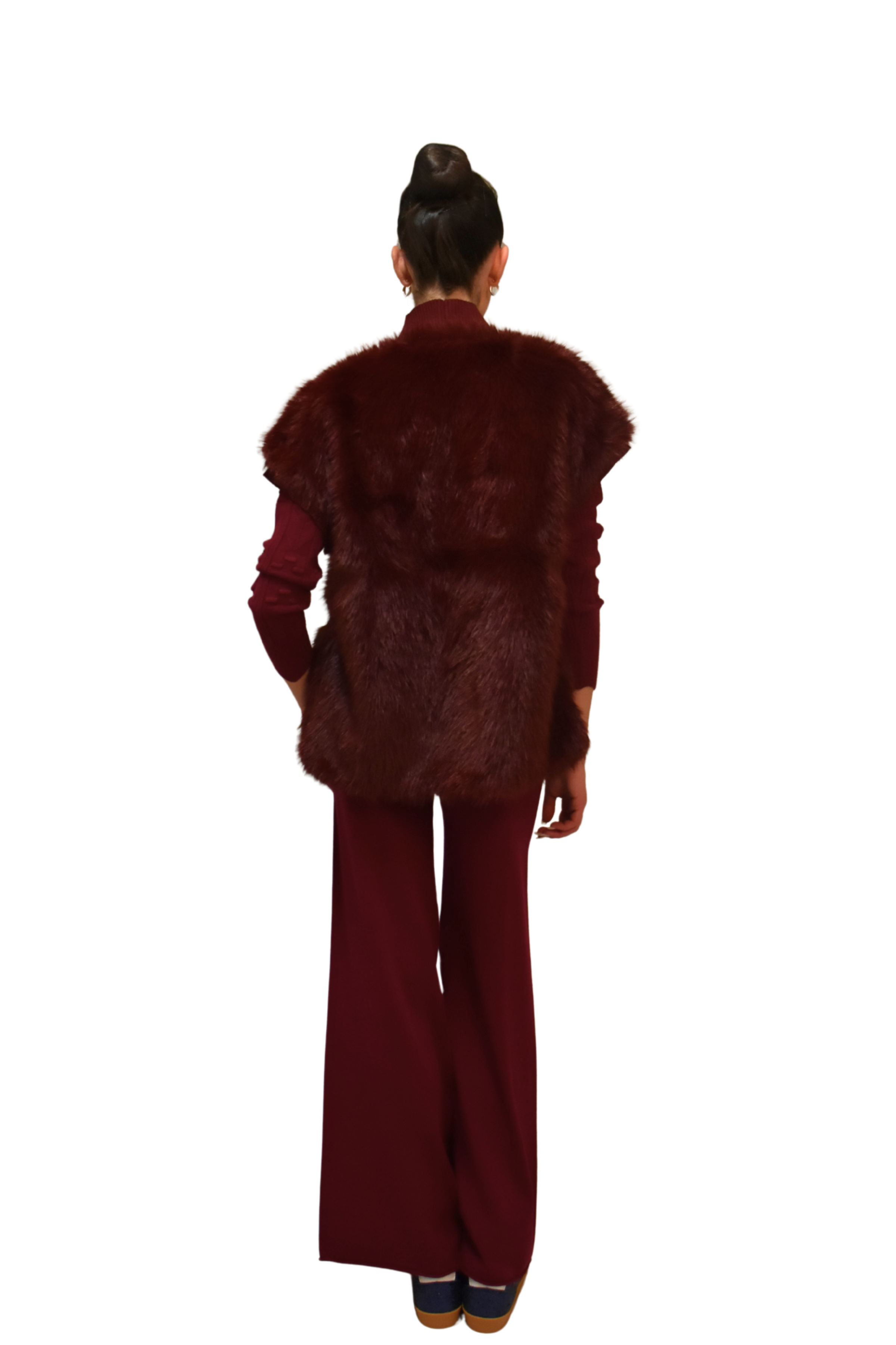 Giacca senza maniche con inserti in maglia, in finto pelo color borgogna, tasche laterali inserite.