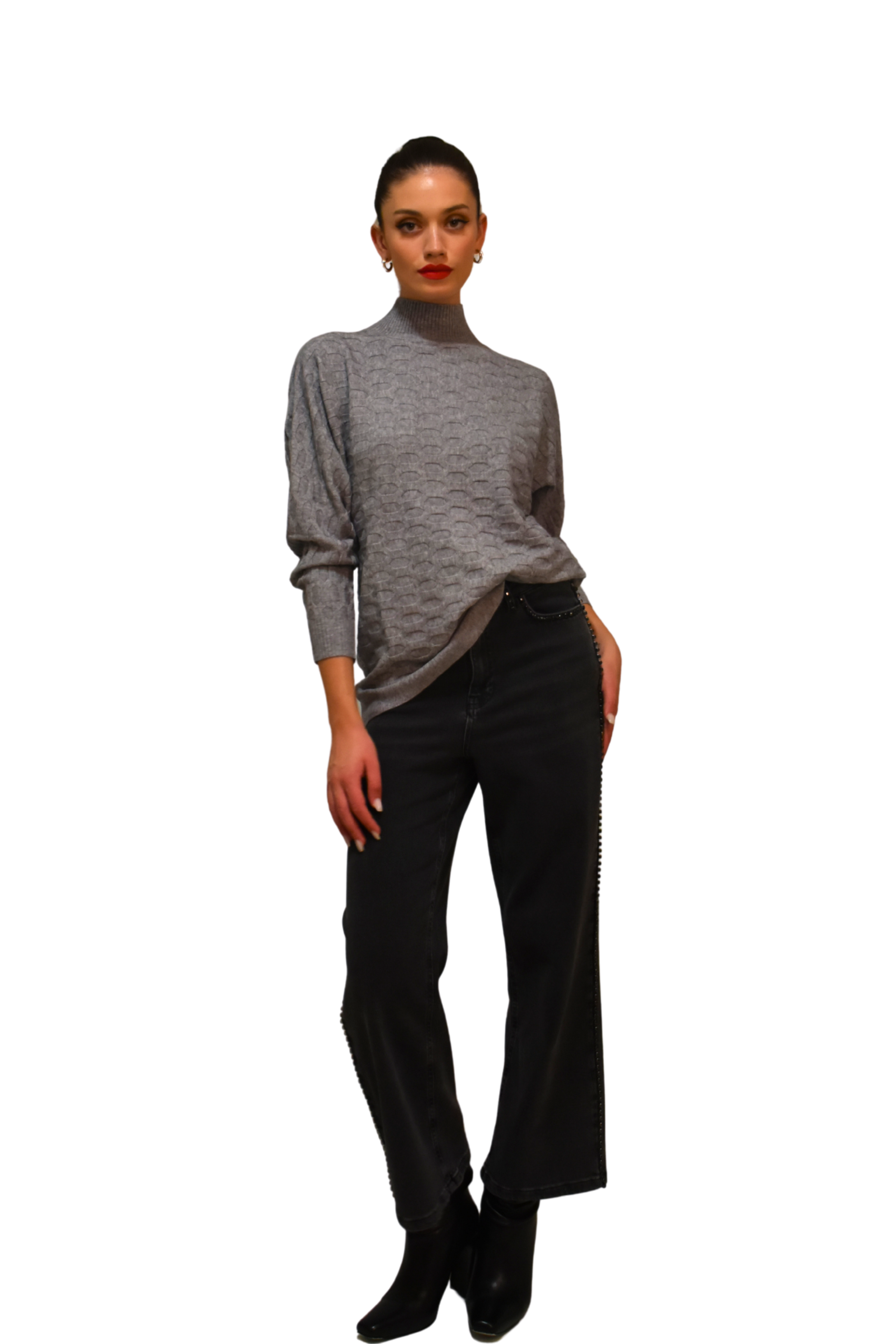 Maglia over a collo alto grigia realizzata con lavorazione a rilievo.