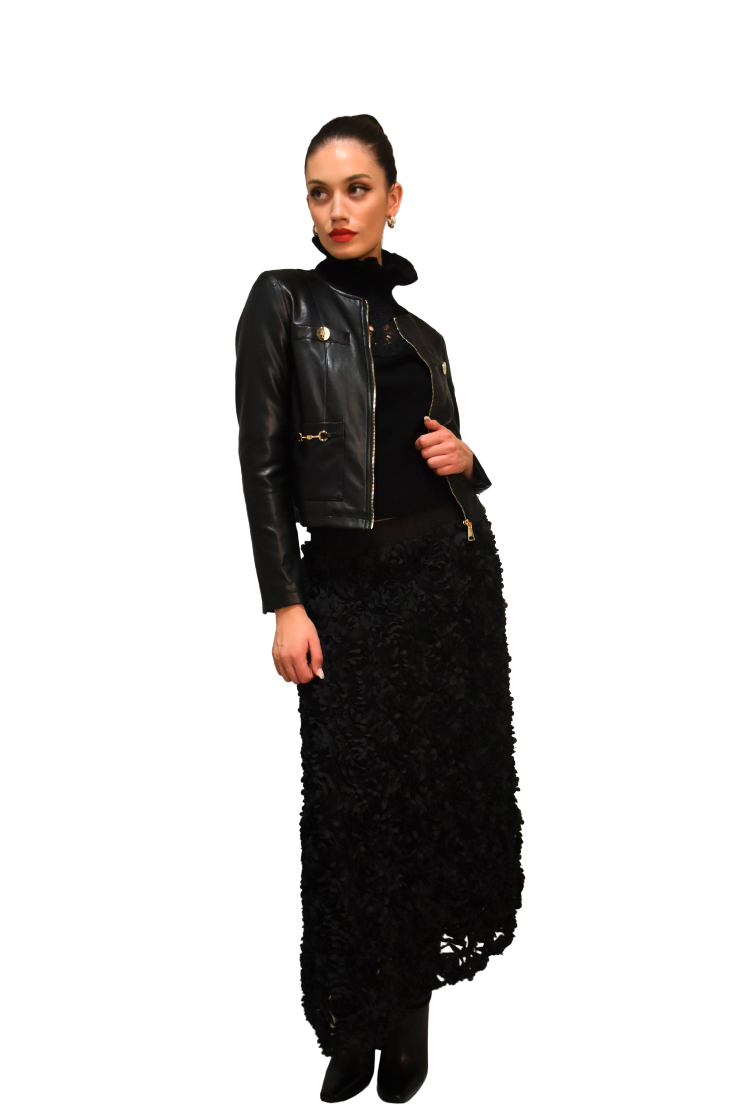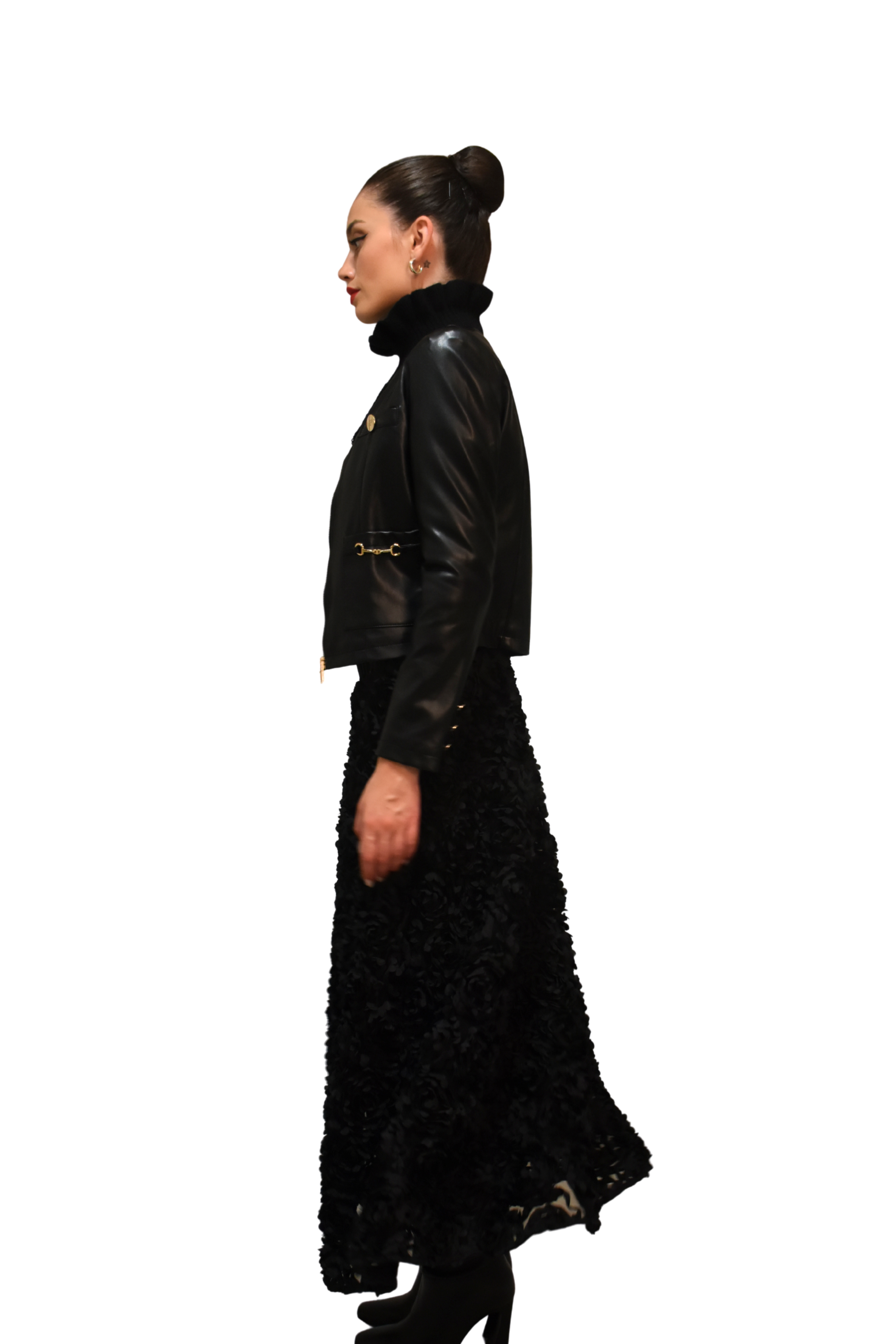 Giacca corta in ecopelle nera, silhouette a scatola con bottoni logati in metallo dorato.