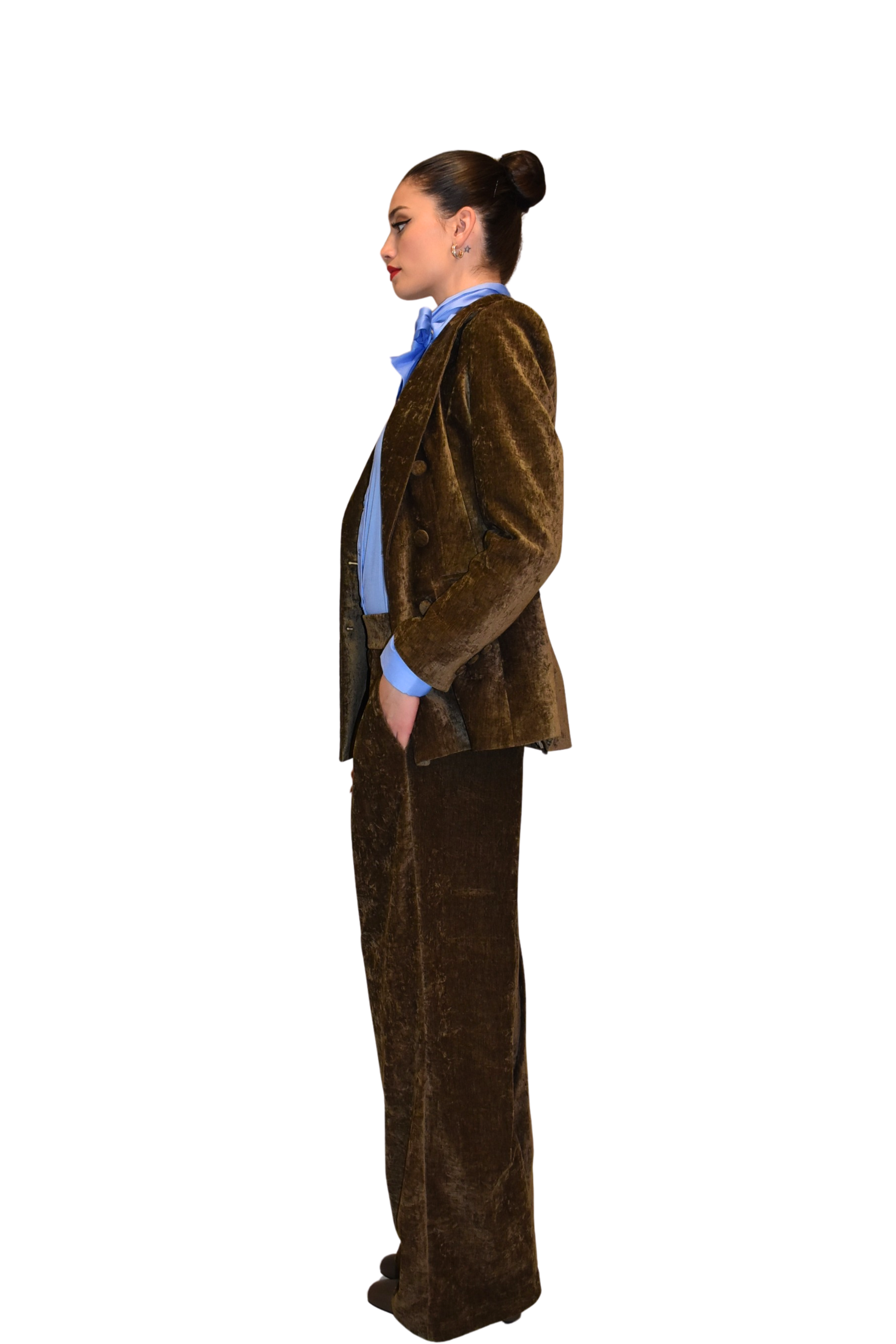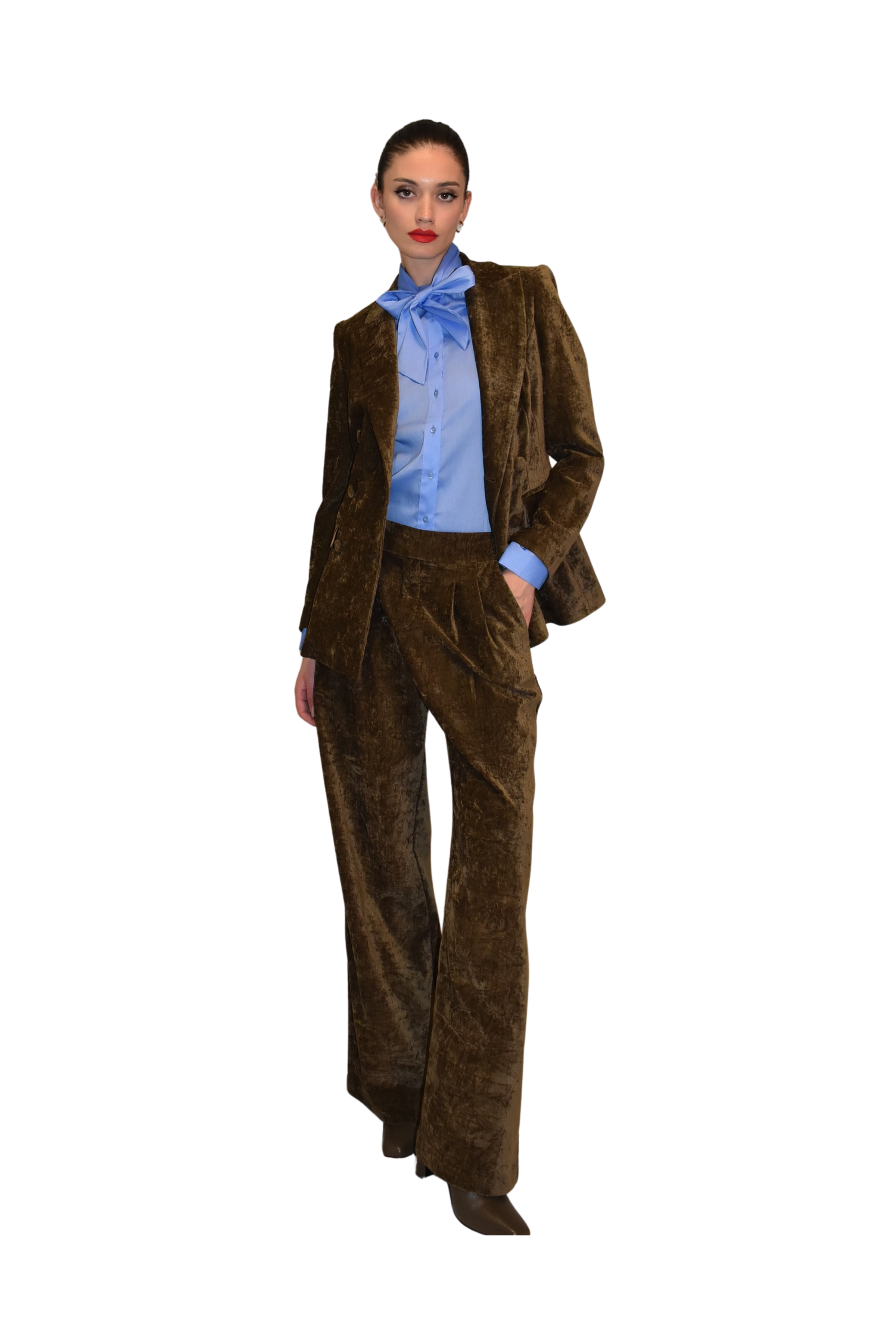 Giacca a manica lunga in velluto stretch verde malva dal fit oversize, modello doppiopetto con bottoni rivestiti.