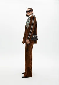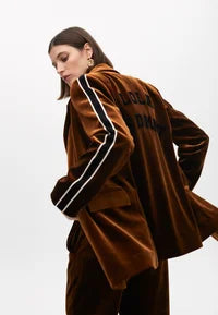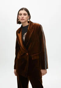 Giacca blazer color bronzo in velluto stretch effetto ciniglia con bande a contrasto sulle maniche, modello a doppio petto dalla vestibilità morbida.