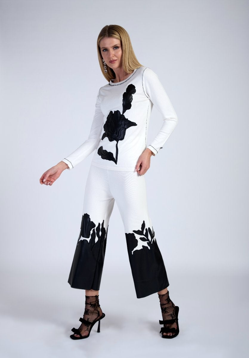Maglia bianca in viscosa con impunture a contrasto, dettaglio di stampa a rilievo in ecopelle nera, modello dalla vestibilità ampia.