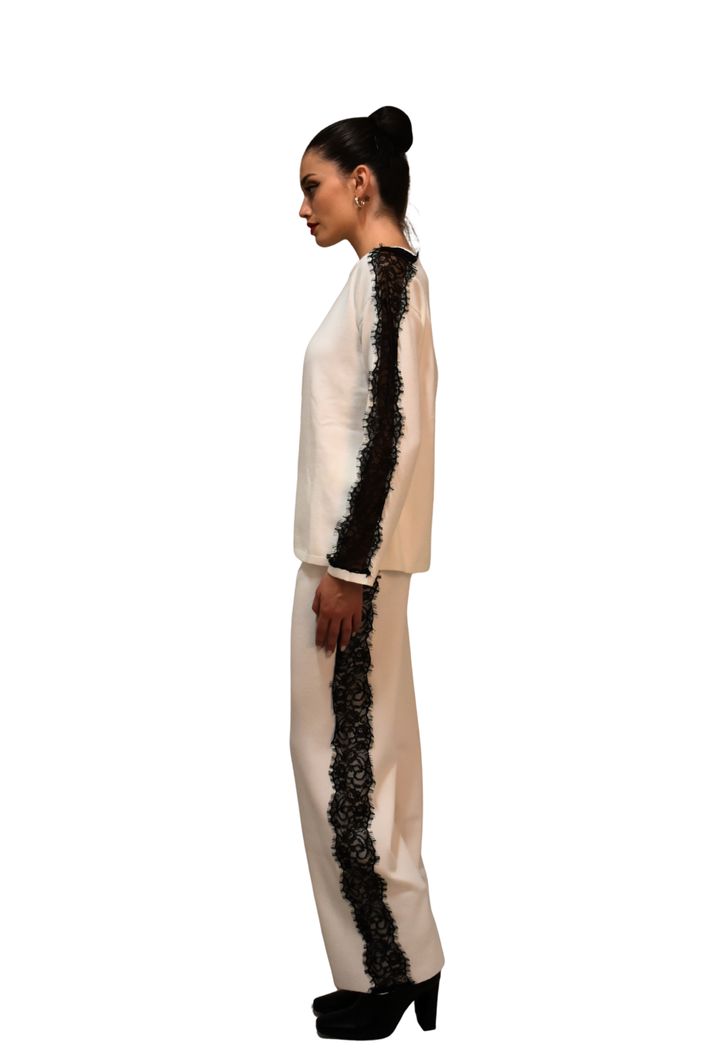 Maglia dalla linea ampia, in viscosa bianca con inserti di pizzo nero trasparente sulle maniche lunghe.