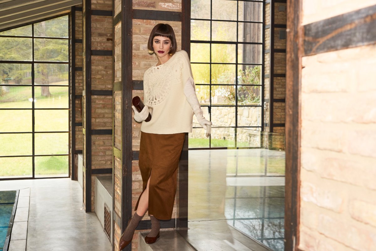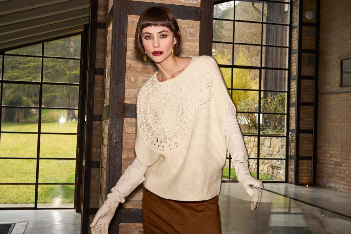 Maglia in lana color panna, con intarsio frontale lavorato a uncinetto.