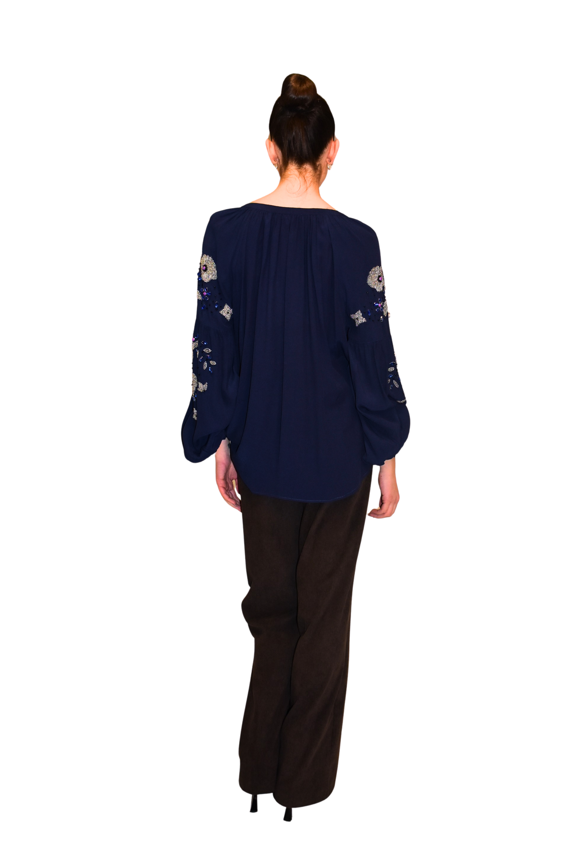 Blusa in morbida viscosa blu, presenta una silhouette con maniche a sbuffo e perline e crisatalli colorati ricamati a mano con motivi floreali.