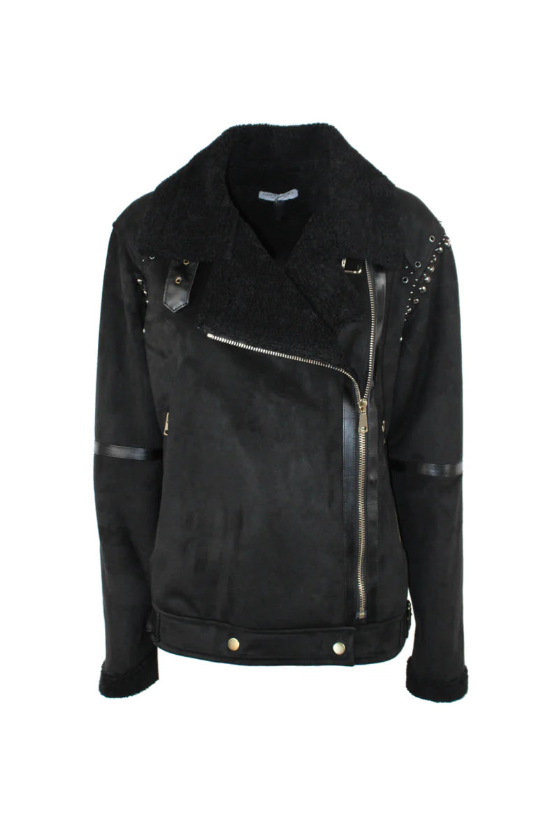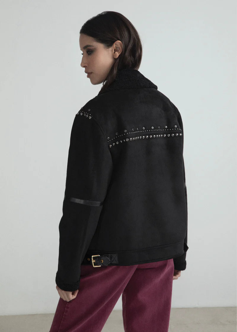 Ecomontone nero in tessuto esterno scamosciato, presenta shearling internamente in tono, inserti in pelle e borchie applicate sul retro.
