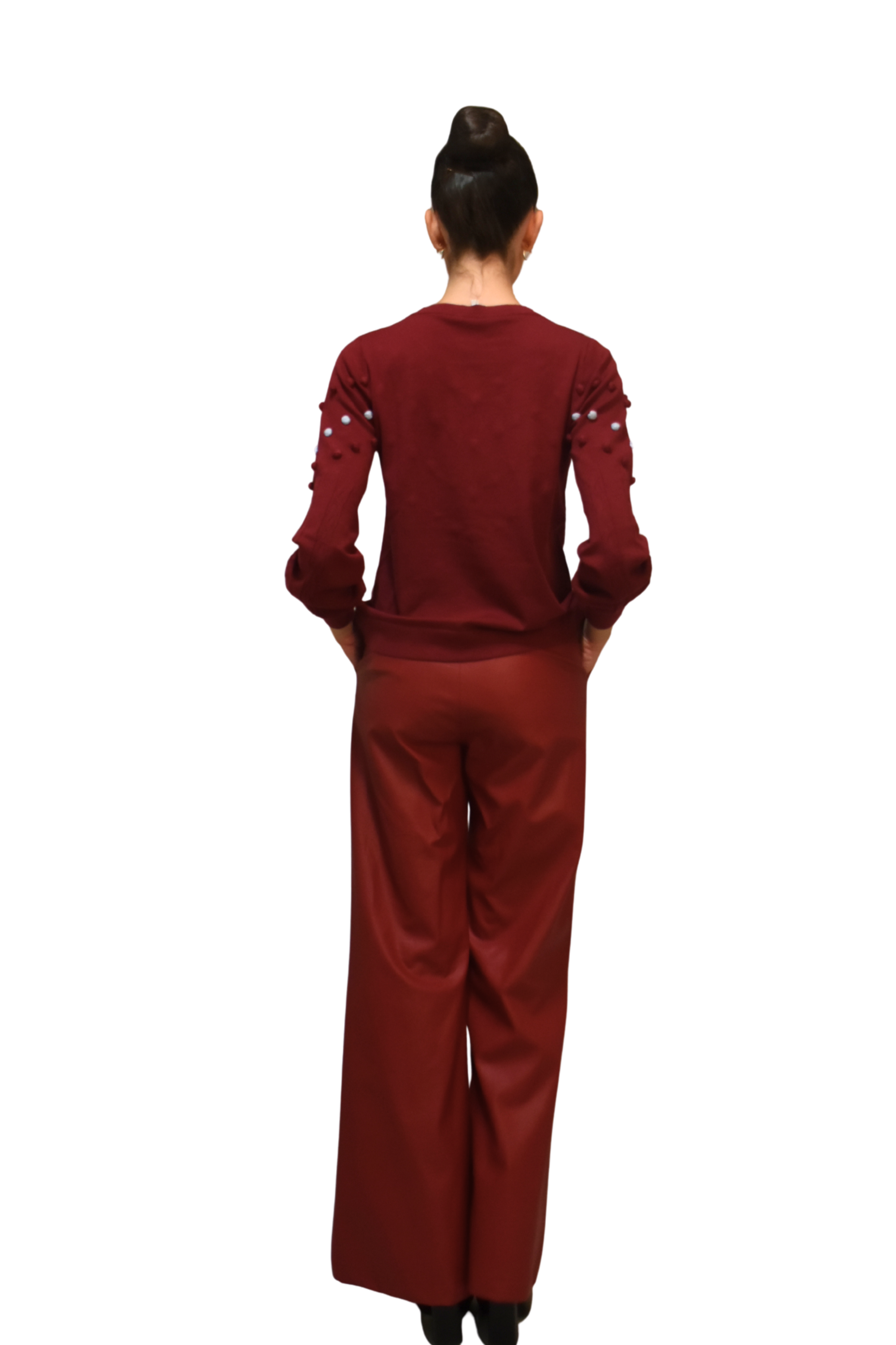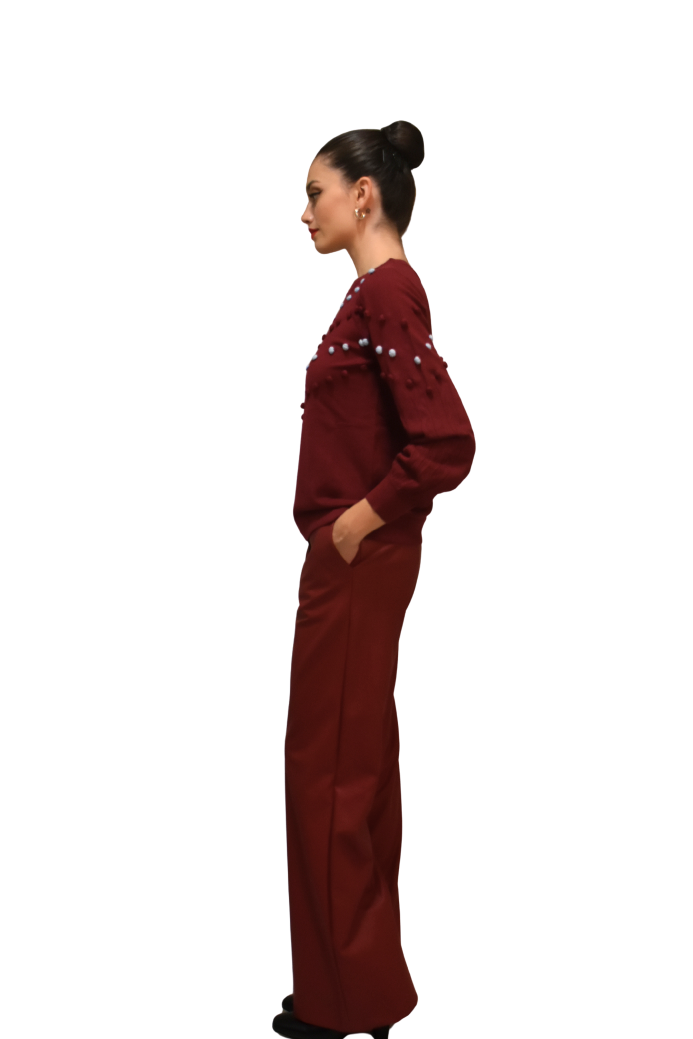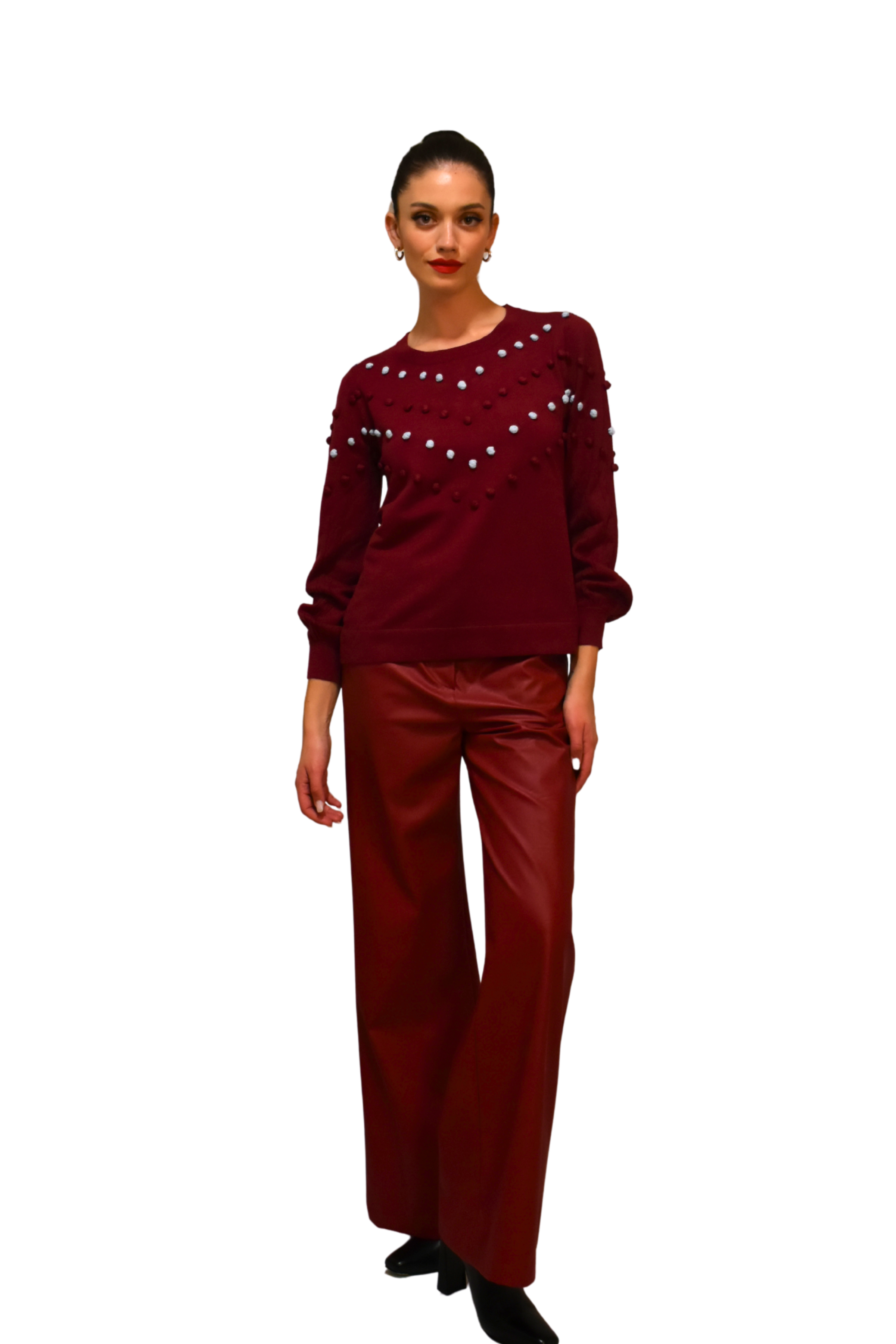 Maglia girogola in viscosa bourgogne, realizzata con pom-pon colorati sul davanti.
