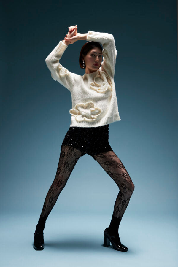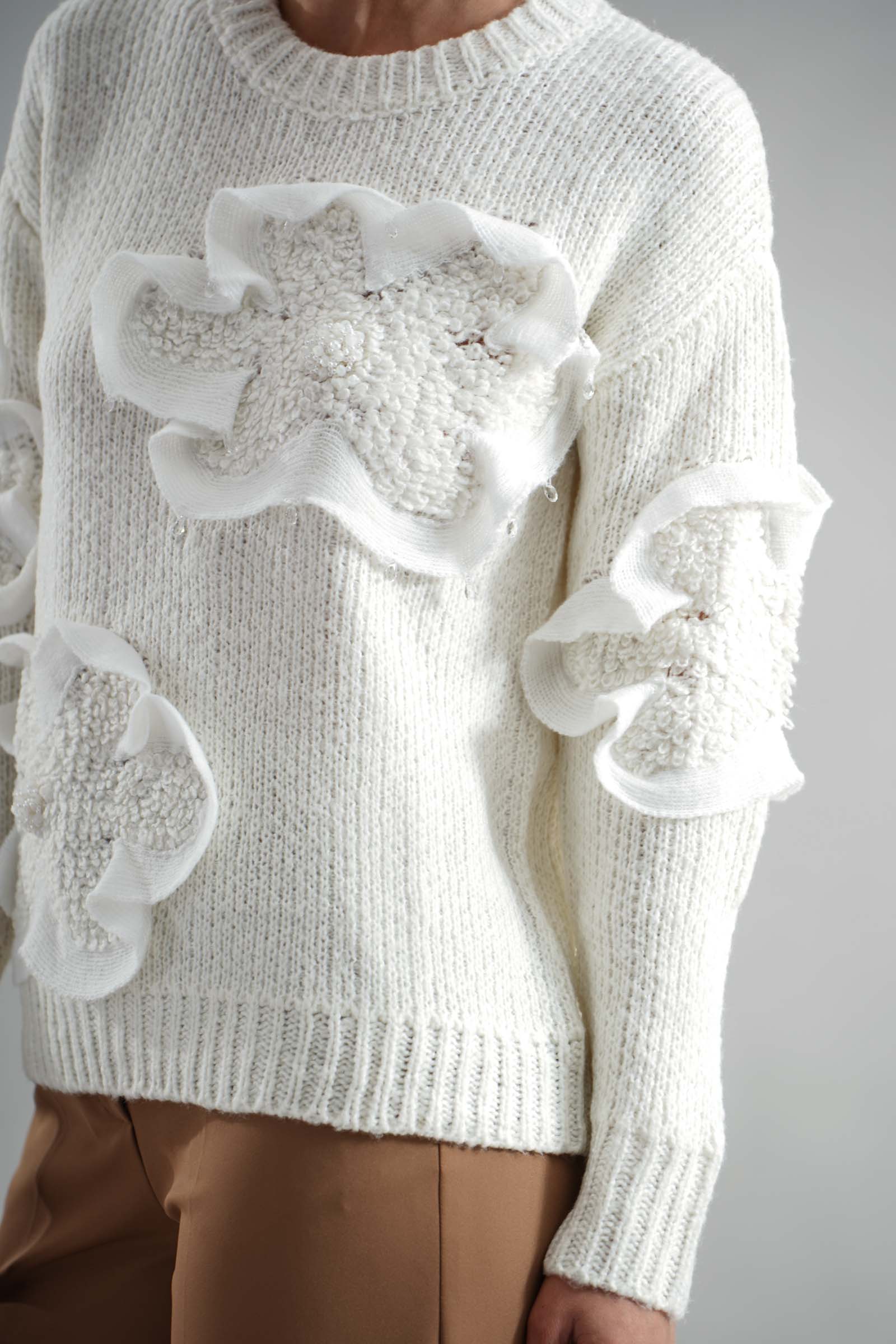 Maglia in misto lana color panna, realizzata con lavorazione a rilievo motivo floreale, impreziosita da ricami perline in tono.