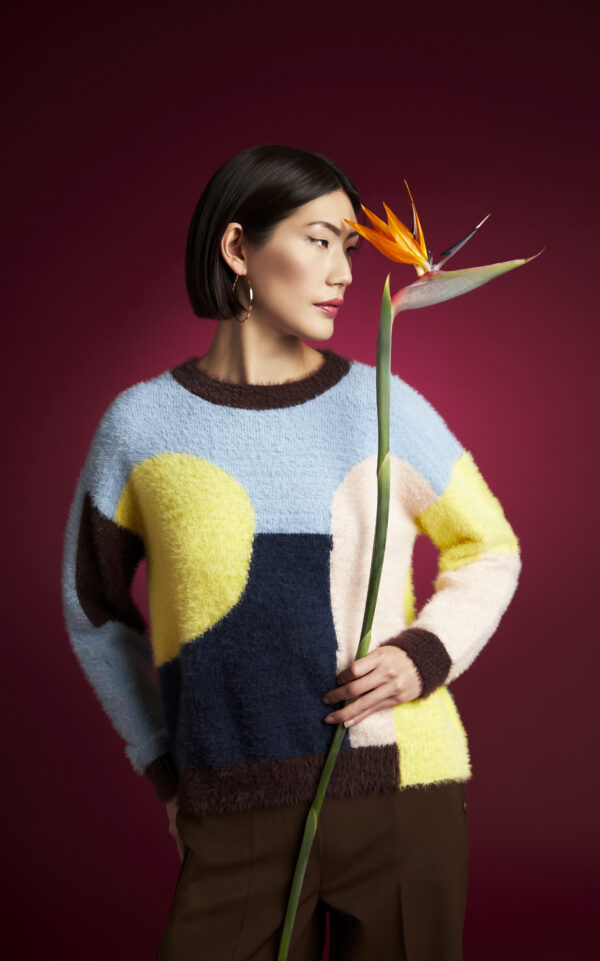 Maglia in materiale a pelo lungo a motivo geometrico multicolor.
