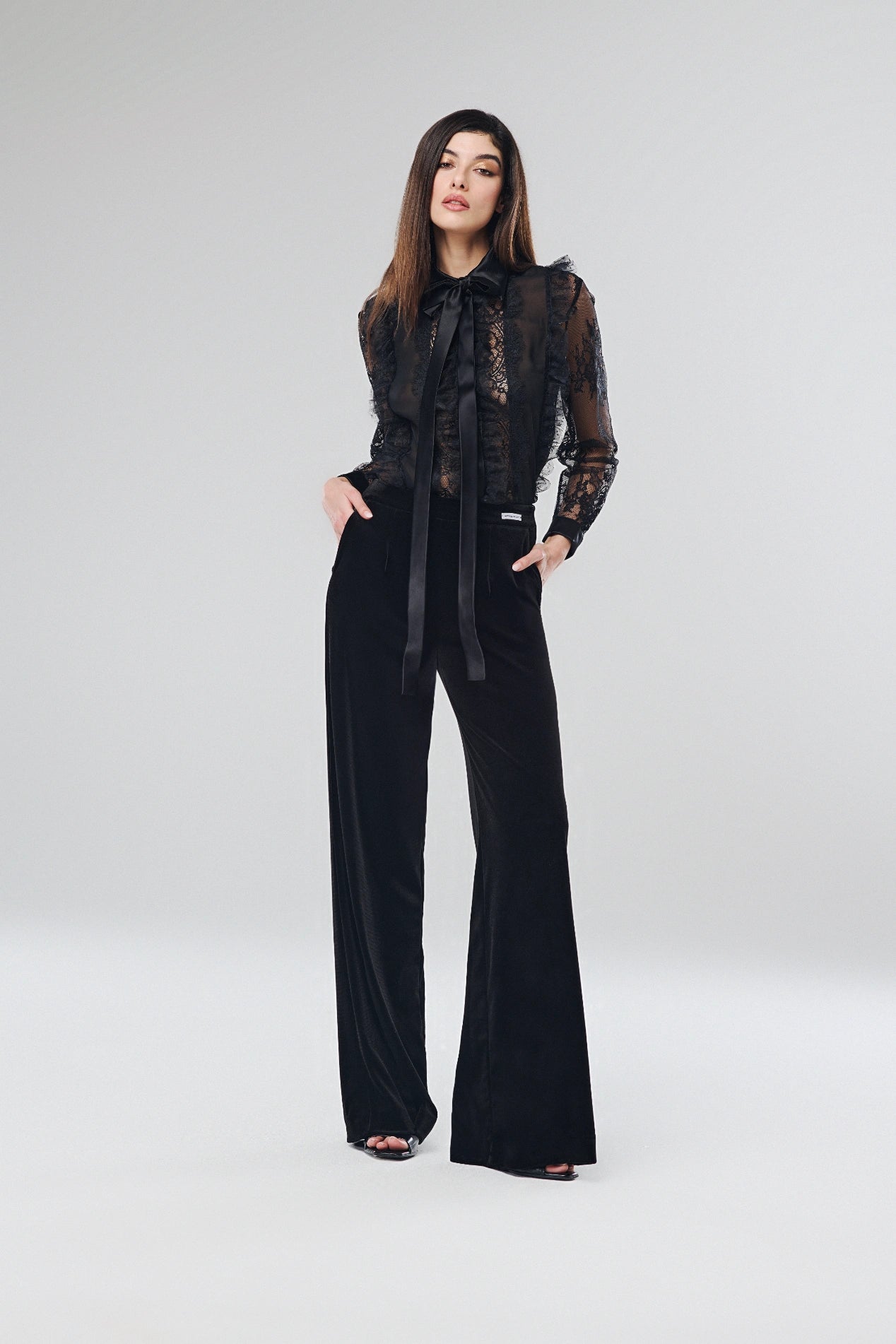 Camicia in chiffon e pizzo trasparente nero con sciarpetta di raso da annodare al collo, arricchita da mini rouches.